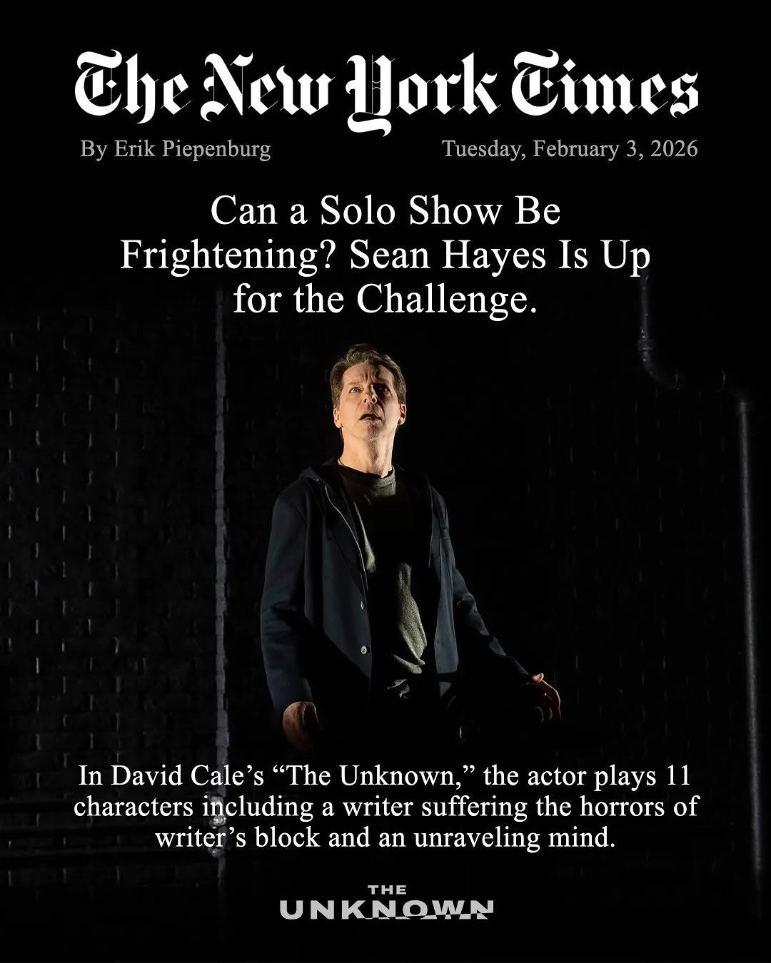 NEW YORK TIMES: This piece, a Q&A with Sean Hayes, asks if a solo show can be frightening. What frightens me is reading he has to play 11 characters! I have nightmares 35 years after my one and only (triumphant) experience onstage — I played Alan in a University of Chicago production of Torch Song Trilogy and still fear forgetting my lines. (I’d do anything if someone unearthed video of me in this play.)