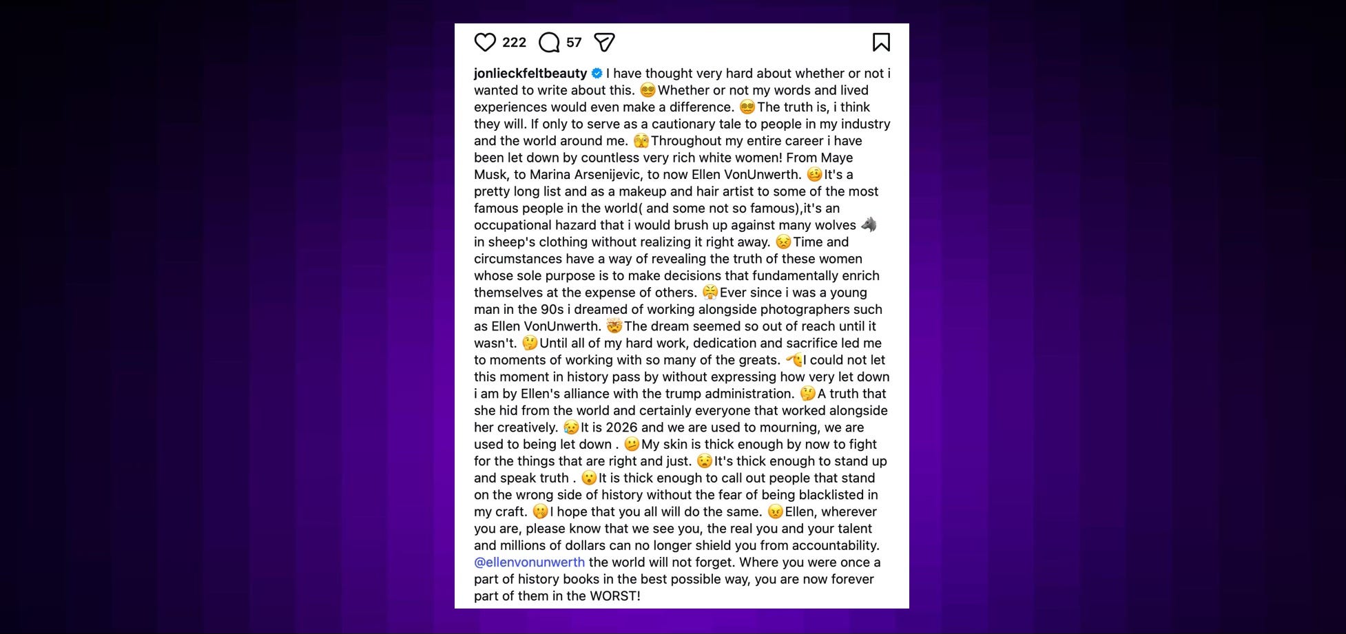 INSTAGRAM: Famed grooming artist Jon Lieckfelt writes movingly about his disappointment in fashion photographer Ellen von Unwerth, who has come out as a full-on MAGAt, shooting Melania for her doc poster and gaily appearing at the film’s premiere.