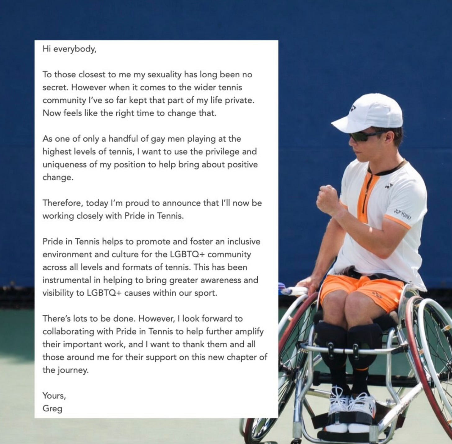 INSTAGRAM: Greg Slade, a wheelchair tennis champ, has come out as gay with a thoughtful post in which he pledges to work closely with Pride in Tennis.