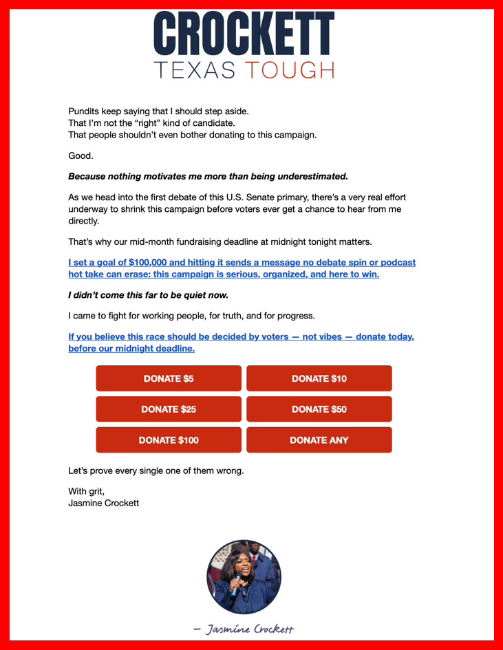 YAHOO: Rep. Jasmine Crockett (D-Texas) is trailing state Rep. James Talarico (D-Texas) in their Senate primary, but Crockett is wisely fundraising off of that gaffe by Matt Rogers and Bowen Yang.