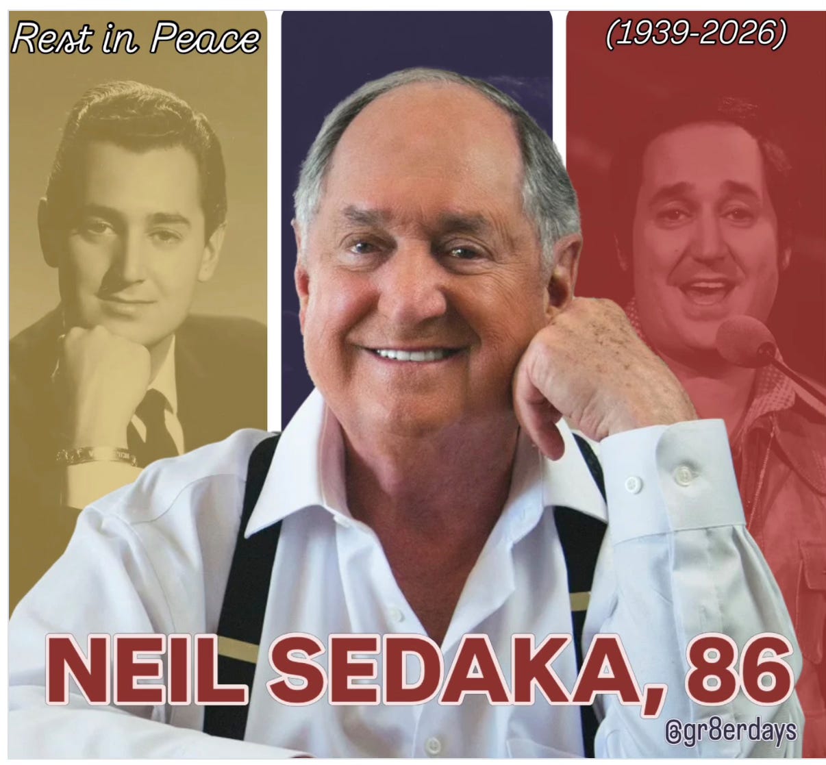 GR8ERDAYS: RIP Neil Sedaka, 86. The legendary songwriter was the man being “Breaking Up Is Hard to Do” and “Bad Blood.”